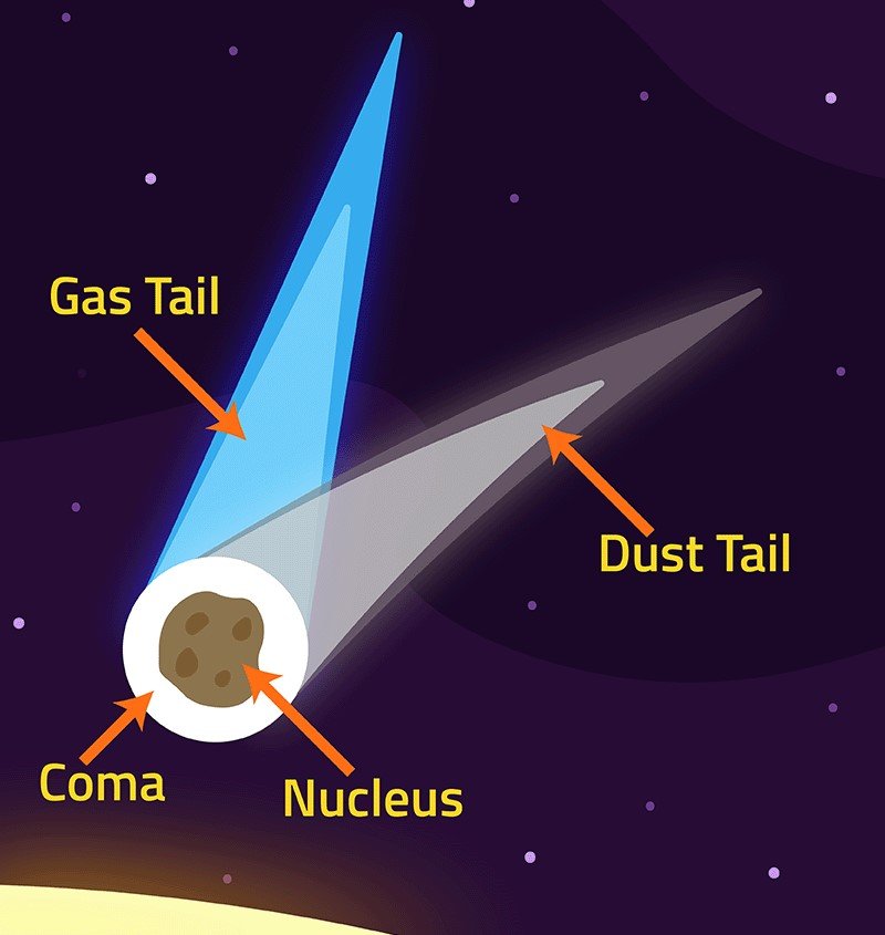 کومٹ گندگی اور برف کے چھوٹے چھوٹے ٹکڑے ہیں۔ جو بیضہ کی شکل کے بہت لمبے راستوں میں سورج کے گرد چکر لگاتے ہیں۔ جب وہ سورج کے سب سے قریب ہوتے ہیں تو سورج کی تابکاری ان کی چمک کا باعث بنتی ہے۔ زیادہ تر کومٹ بہت چھوٹے یا بہت دور ہوتے ہیں جو کبھی بھی زمین سے نظر نہیں آتے۔ کومٹ بیرونی نظام شمسی کے دو حصوں سے آتے ہیں: کوئپر بیلٹ اور اورٹ کلاؤڈ۔