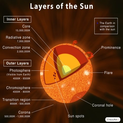 سورج کا گرم ترین حصہ اس کا مرکز ہے جہاں درجہ حرارت 27 ملین فورن ہائٹ یعنی 15 ملین سینٹی گریڈ ہے