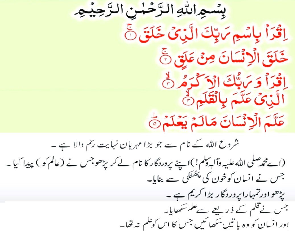 آپ صلی اللہ علیہ والہ وسلم کی عمر 40 برس ہوئی تو آپ صلی اللہ علیہ والہ وسلم غار حرا میں خدا کے بارے میں سوچ و بچار میں مصروف تھے کہ جبرائیل علیہ السلام پہلی وحی لے کر آپ صلی اللہ علیہ والہ وسلم کی خدمت میں حاضر ہوئے آپ صلی اللہ علیہ والہ وسلم کو (اقرا ء) پڑھنے کے لیے کہا آپ صلی اللہ علیہ والہ وسلم نے فرمایا میں پڑھا ہوا نہیں ہوں اس پر جبرائیل علیہ السلام نے آپ صلی اللہ علیہ والہ وسلم کو سینے سے لگا کر بھینچا اور کہا پڑھیے آپ صلی اللہ علیہ والہ وسلم نے ا پنا سابقہ جواب دہرایا جبرائیل علیہ السلام نے آپ صلی اللہ علیہ والہ وسلم کو دوسری اور تیسری بار سینے سے لگایا اور پڑھنے کی درخواست کی آپ صلی اللہ علیہ والہ وسلم نے فرمایا مجھے پڑھنا نہیں آتا اس پر جبرائیل علیہ السلام نے آپ صلی اللہ علیہ والہ وسلم پر پہلی وحی نازل کی اور آپ صلی اللہ علیہ وسلم کو یہ آیات پڑھوائیں